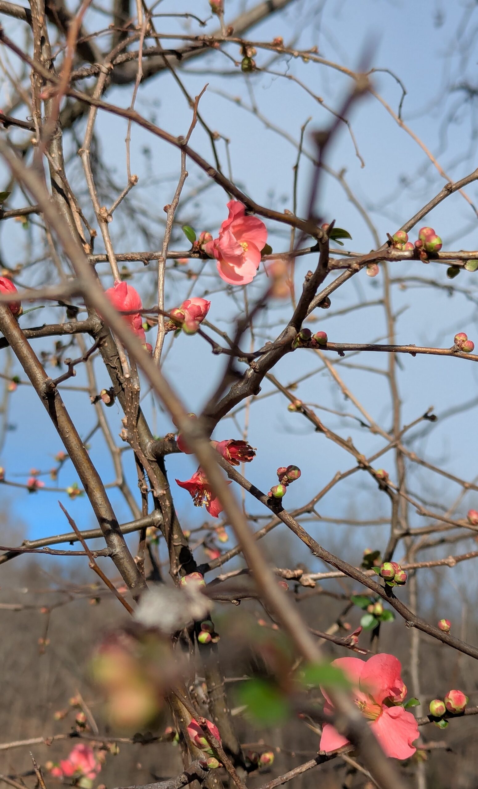 While we probably have six weeks of (mostly mild) winter ahead of us, I’ve started seeing signs of eventual spring. I’ve noticed tiny buds of what will eventually be jonquils. I’ve caught glimpses of cheerful bright yellow masses of forsythia, and when I was visiting Dad this past weekend, I caught sight of my mother’s delicate pink japonica blooming against a cold January sky.